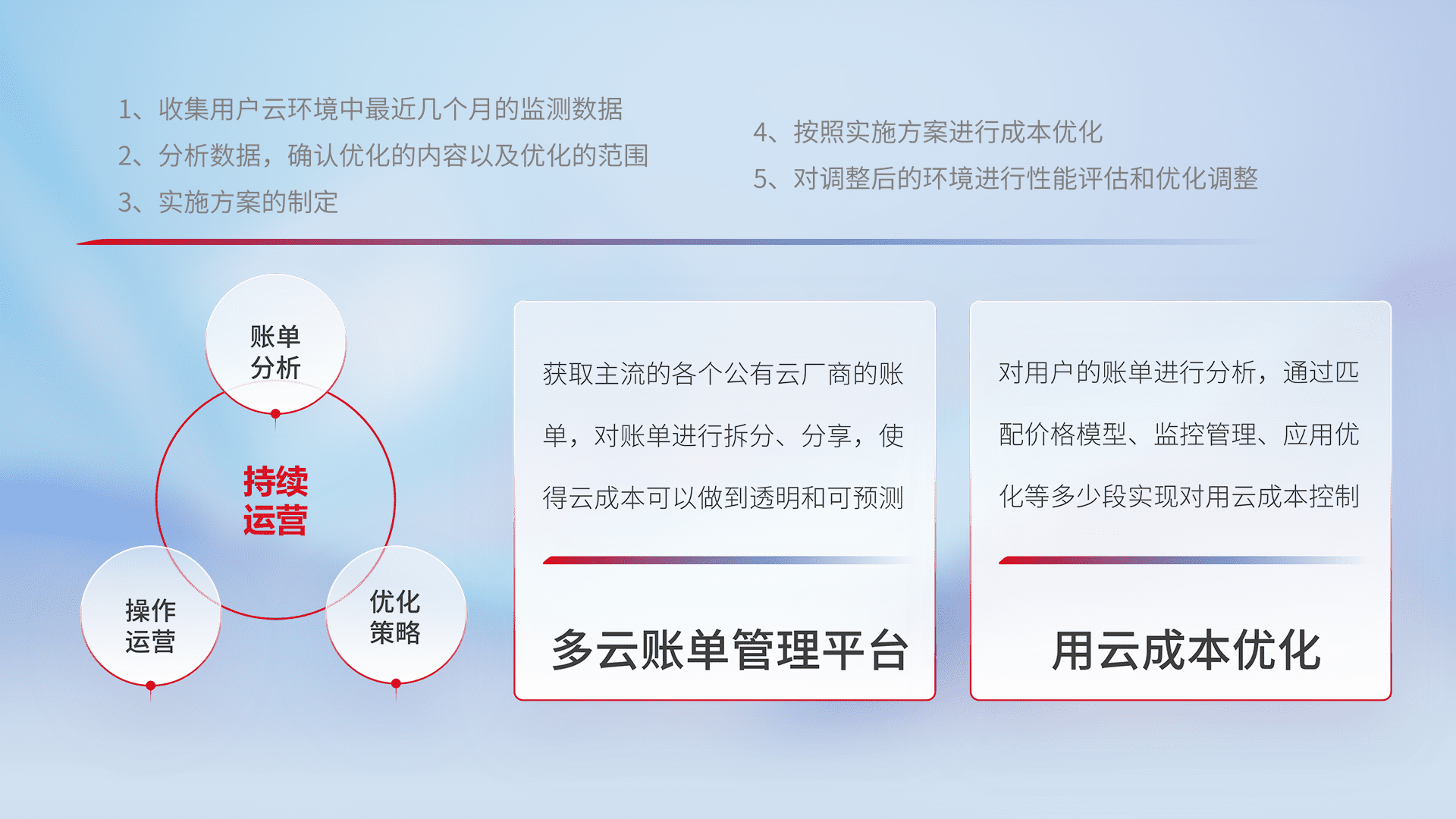 通过多云纳管,,,以统一的资源数据模型把客户的云资源进行抽象和封装,,进而实现对多云资源的统一操作,,保障云资源管理的可靠性、、、稳定性与可用性。。。量身定制化运维内容,,配置、、开发运维、、、、补丁管理、、备份、、、、监控、、、认证和访问管理、、审计和日常巡检等,,,保障在用云过程中的可靠度,,,,稳定度以及高可用率。。。